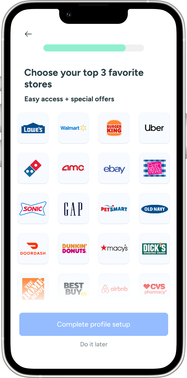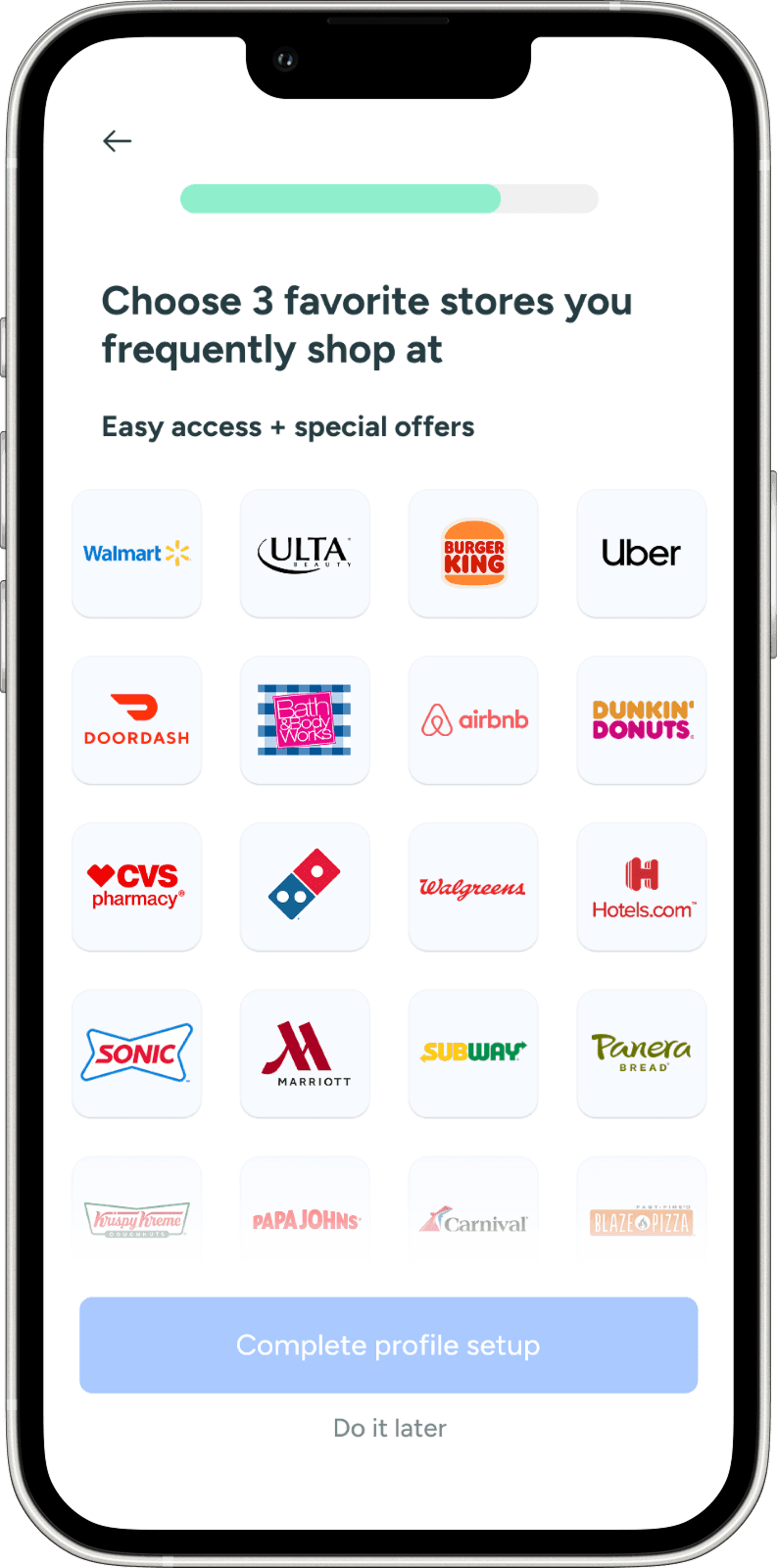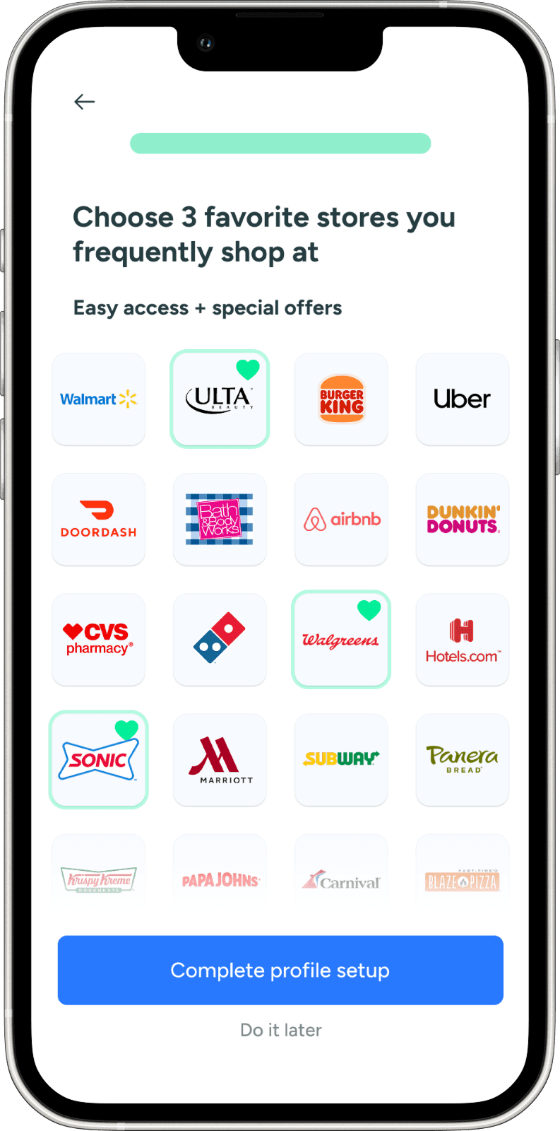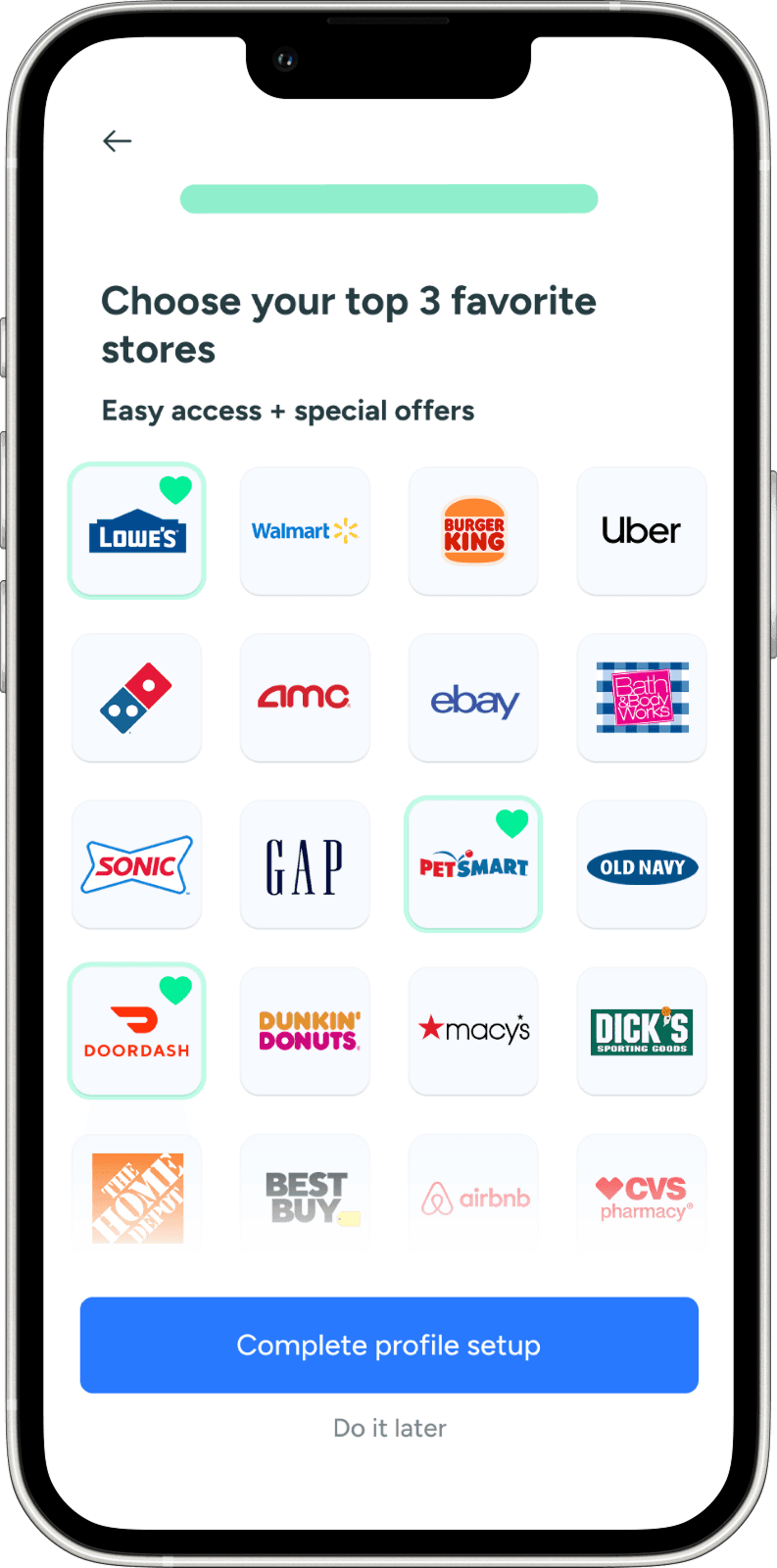 As part of the revamped onboarding, making the first purchase became the second milestone toward earning the full bonus reward. Users were shown a curated list of 20 popular stores and asked to select their favorites. Immediately afterward, only their selected stores were displayed as options for completing their first purchase.