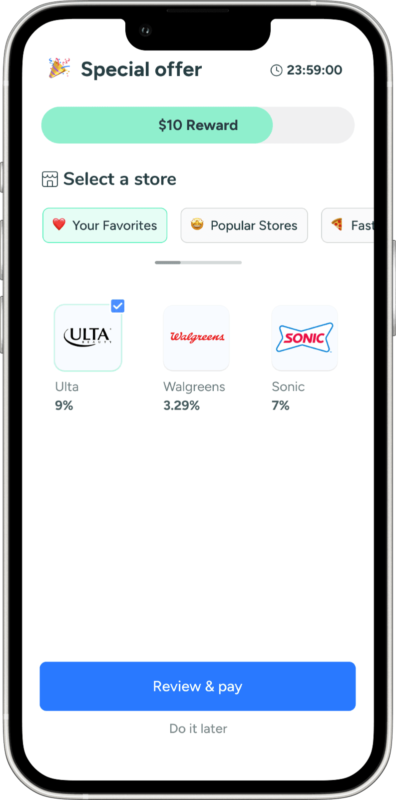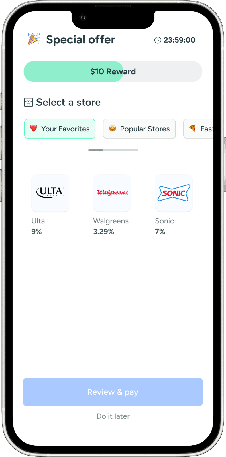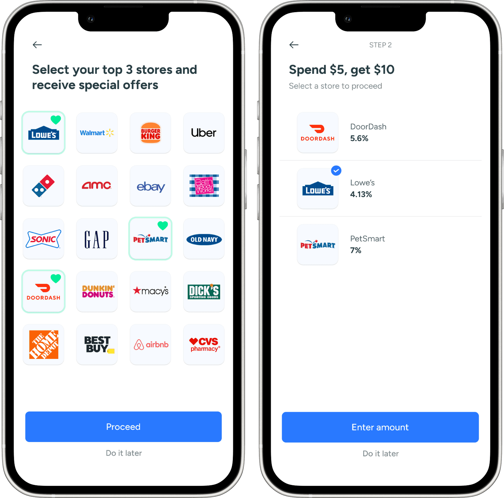 As part of the revamped onboarding, making the first purchase became the second milestone toward earning the full bonus reward. Users were shown a curated list of 20 popular stores and asked to select their favorites. Immediately afterward, only their selected stores were displayed as options for completing their first purchase.