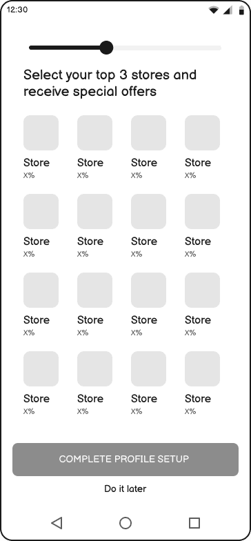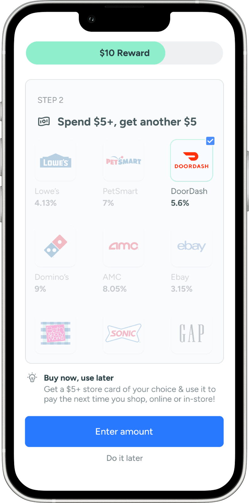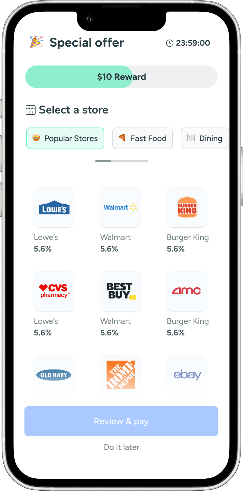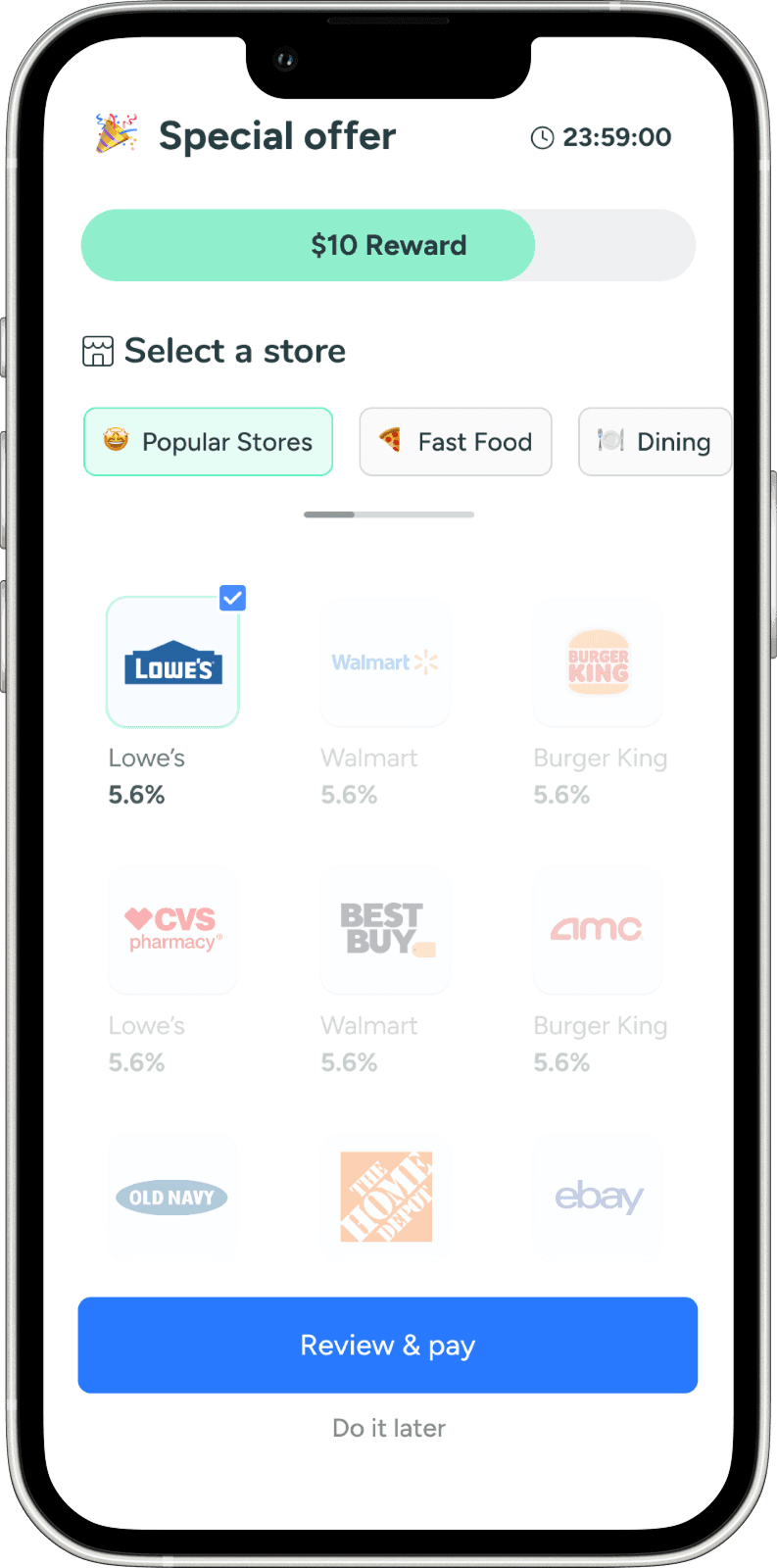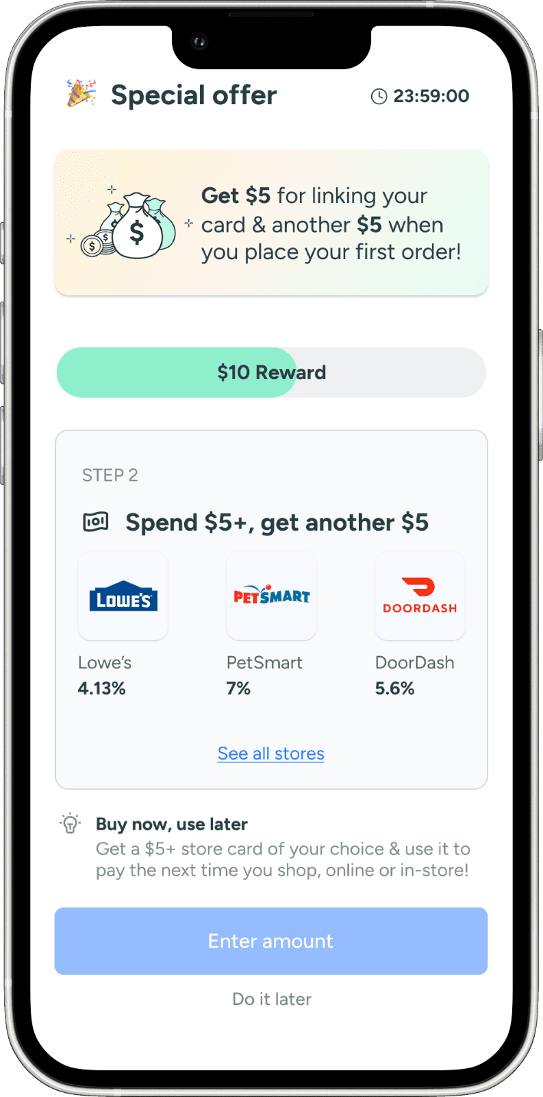 As part of the revamped onboarding, making the first purchase became the second milestone toward earning the full bonus reward. Users were shown a curated list of 20 popular stores and asked to select their favorites. Immediately afterward, only their selected stores were displayed as options for completing their first purchase.
