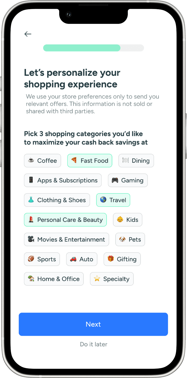 We also addressed data privacy concerns with updated copy, clearly assuring users that their preference data is used solely to provide relevant cashback offers.