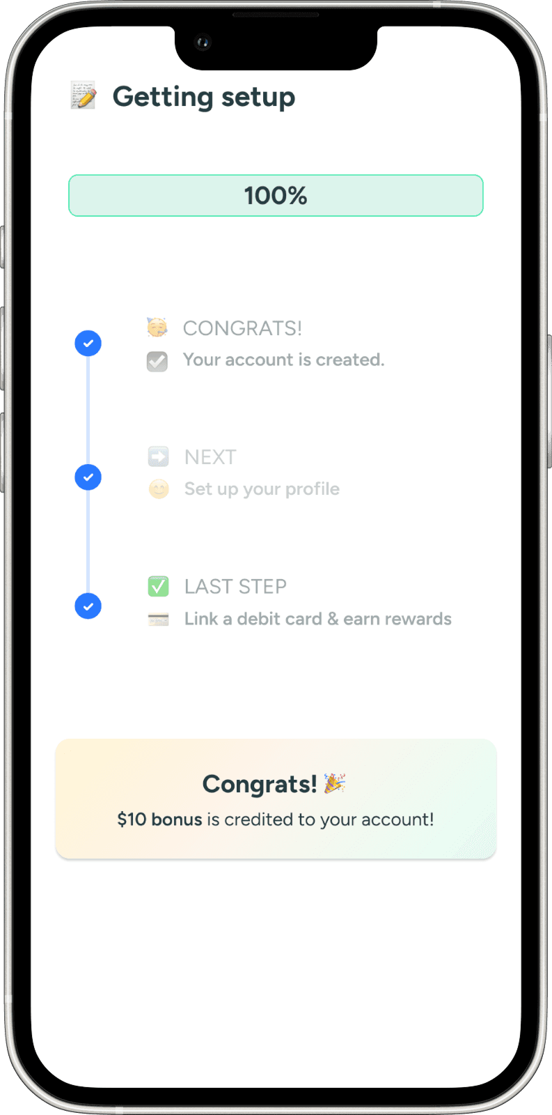 To address the increasing length of the onboarding flow, we consolidated key actions into three clearly defined sections, with each section including visible progress indicators and status messaging. This reframed onboarding from a task-heavy flow into a goal-oriented journey anchored by a bonus reward incentive.